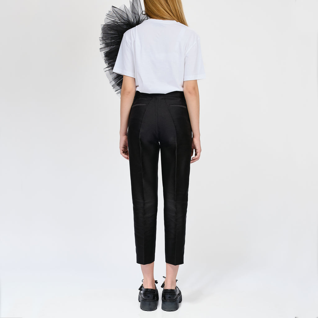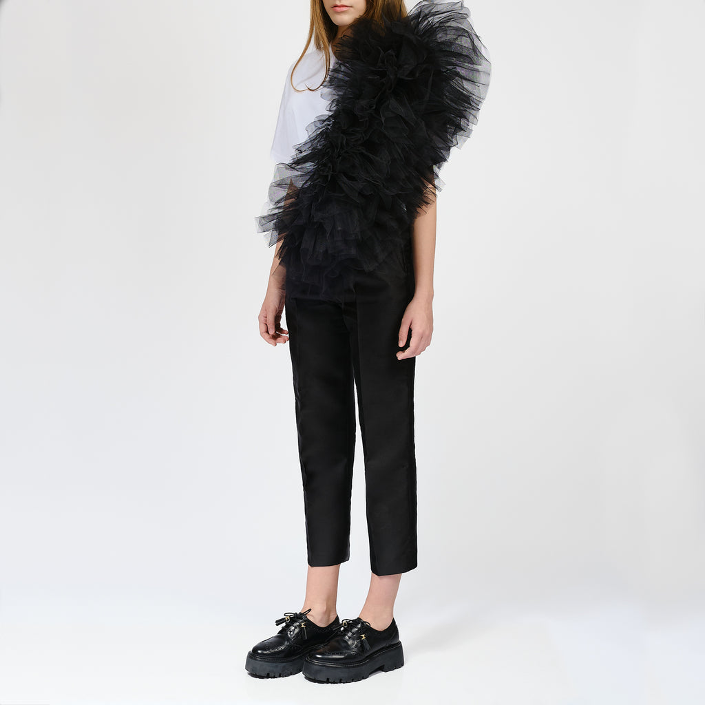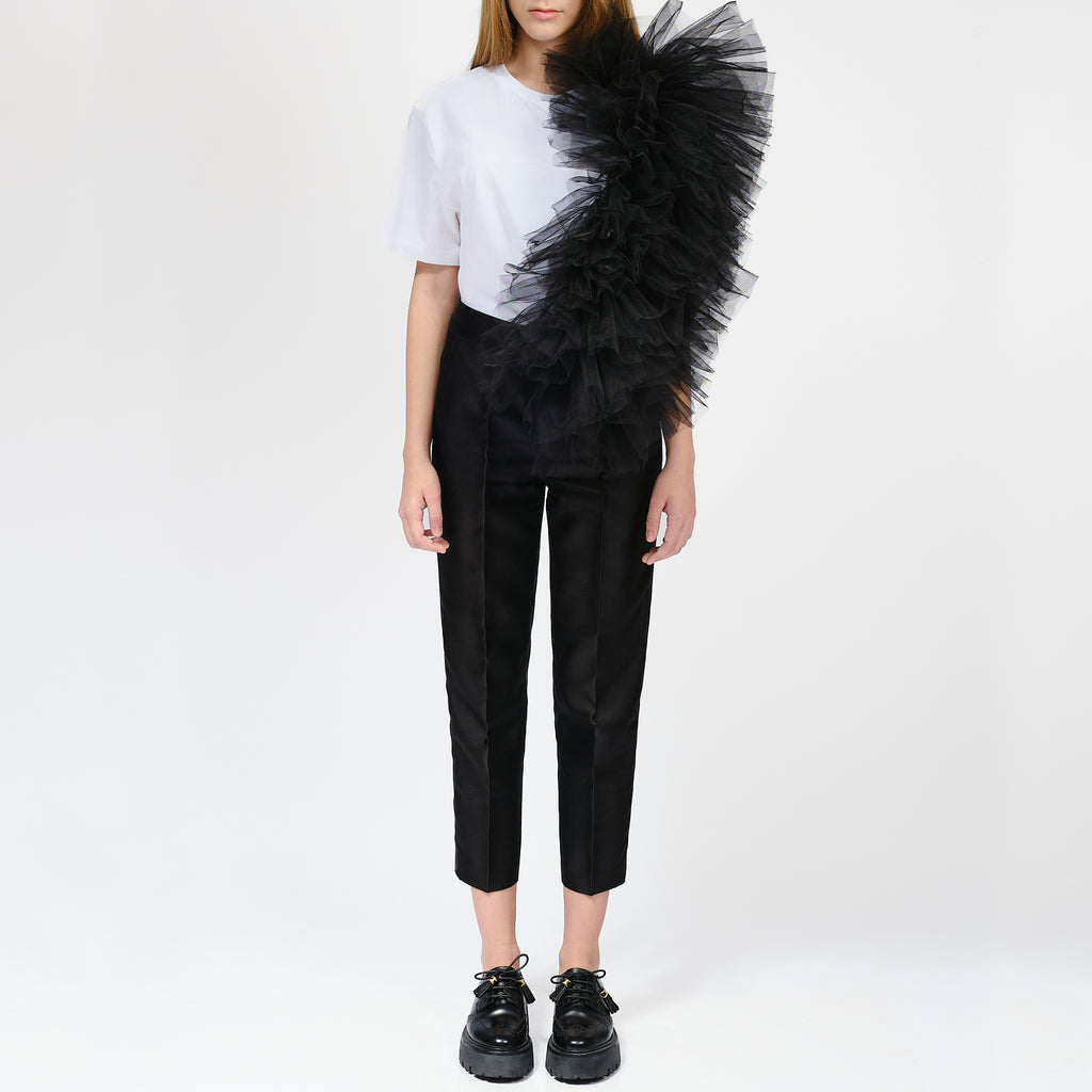 The standout feature of this design is the cascading black ruffle detailing that flows gracefully from the shoulders, adding a dynamic element to the classic silhouette. This ruffled application creates movement and texture, elevating the overall look.