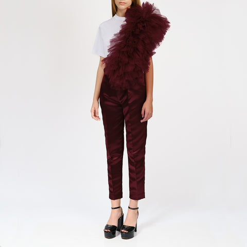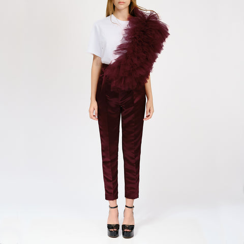 The standout feature of this design is the cascading burgundy ruffle detailing that flows gracefully from the shoulders, adding a dynamic element to the classic silhouette. This ruffled application creates movement and texture, elevating the overall look.